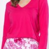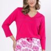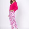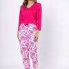 Piżama damska z rękawem 7/8 długości i spodniami 7/8 długości. Dekolt bluzki w serek. Wzorzyste spodnie ozdobione w pasie kokardą. Spodnie mają po bokach kieszenie. Piżama uszyta jest ze 100% bawełny. Piękna piżama damska w kolorze fuksji.