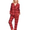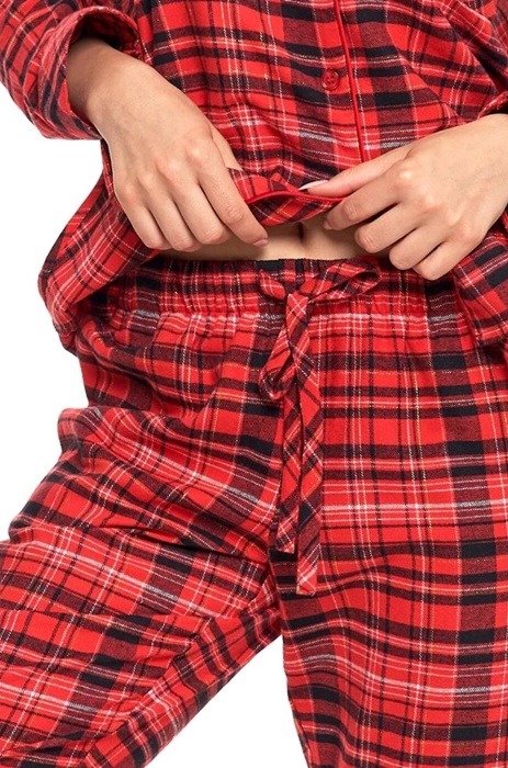 Flanelowa piżama damska z długim rękawem i długimi spodenkami w elegancka kratę, z kieszeniami. Bluzeczka od piżamy ma dekolt w serek z kołnierzykiem i jest zapinana na guziki, ma na piersi praktyczną kieszonkę.