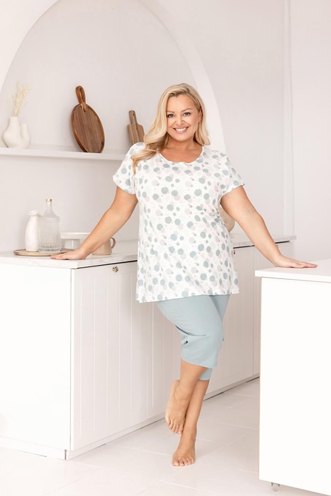 Piżama damska bawełniana Regina z krótkimi rękawkami oraz spodniami typu rybaczki – długości 3/4. Bluzka od piżamy z okrągłym dekoltem, w kolorowe koła. Piżama damska Regina uszyta jest z miękkiej, wysokiej jakości 100% bawełny.