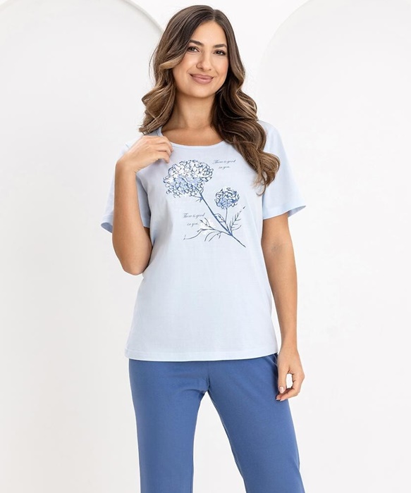 Piżama damska bawełniana Regina z krótkimi rękawkami oraz spodniami typu dłuższe rybaczki – długości 7/8. Bluzka od piżamy z okrągłym dekoltem, z grafiką z kwiatem. Piżama damska Regina uszyta jest z miękkiej, wysokiej jakości 100% bawełny.