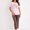 Piżama damska bawełniana Regina z krótkimi rękawkami oraz spodniami typu dłuższe rybaczki – długości 7/8. Bluzka od piżamy z okrągłym dekoltem, z grafiką z kwiatem. Piżama damska Regina uszyta jest z miękkiej, wysokiej jakości 100% bawełny.