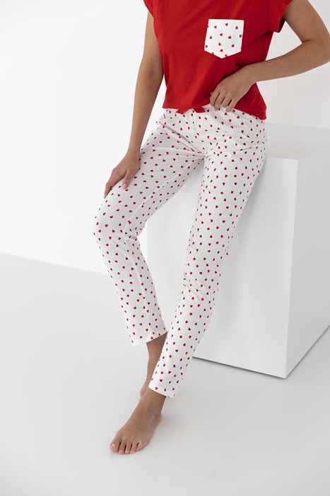 Piżama damska z bluzką z krótkim rękawem i z długimi spodniami. Bluzka od piżamy ma okrągły dekolt, a na piersi kieszonkę. Spodnie od piżamy są długie, w elegancki wzorek w serduszka. Walentynkowa piżama damska w serduszka ze 100% bawełny.
