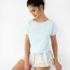 Piżama damska z krótkimi spodniami i koszulką z krótkim rękawem. Piżama uszyta jest ze 100% bawełny. U dołu tasiemka poprowadzona w tunelu. Spodenki z falbanką. Koszulka od piżamy ma okrągły dekolt. Idealna jako krótka piżama na wiosnę i lato.