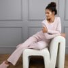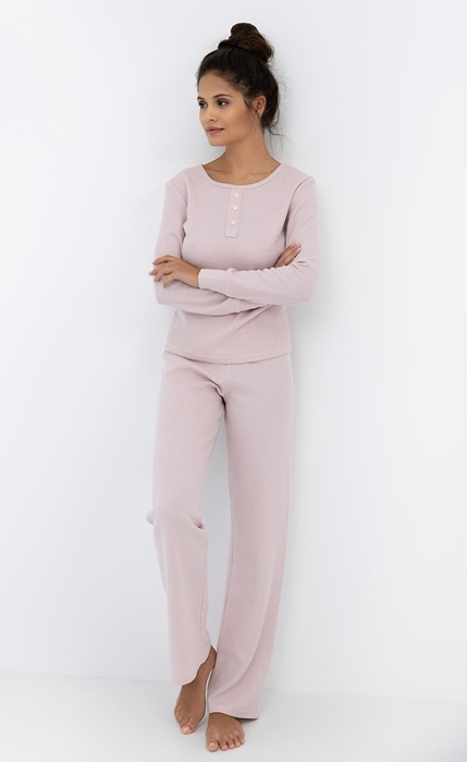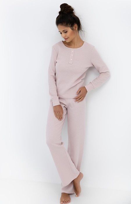 Piżama damska z długim rękawem i długimi spodniami w pudrowo jasno różowym kolorze. Bluzka od piżamy ma okrągły dekolt ze zdobnymi guzikami. Piżama o teksturze waflowej.