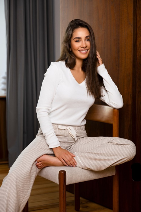 Piżama damska z długim rękawem i długimi flanelowymi spodniami w paski. Bluzka od piżamy ma dekolt w szpic i jest w lekki prążek. Beżowe spodnie od piżamy w pasie mają troczek i są w eleganckie paski. Spodnie z miękkiej flaneli bawełnianej.
