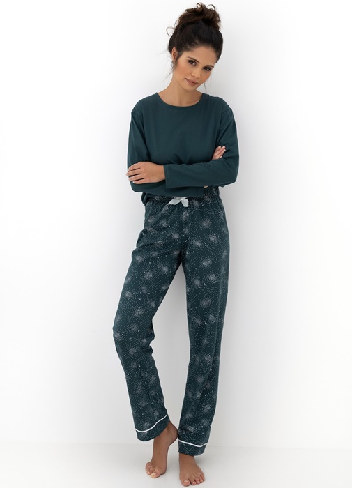 Piżama damska od Sensis ze 100% bawełny. Koszulka od piżamy ma okrągły dekolt i jest w kolorze jednolitym, spodnie zaś są we wzór. Spodnie od piżamy są długie z kokardą w pasie i zdobnymi lamówkami przy nogawkach.