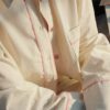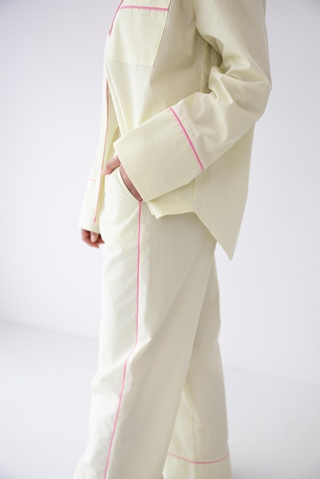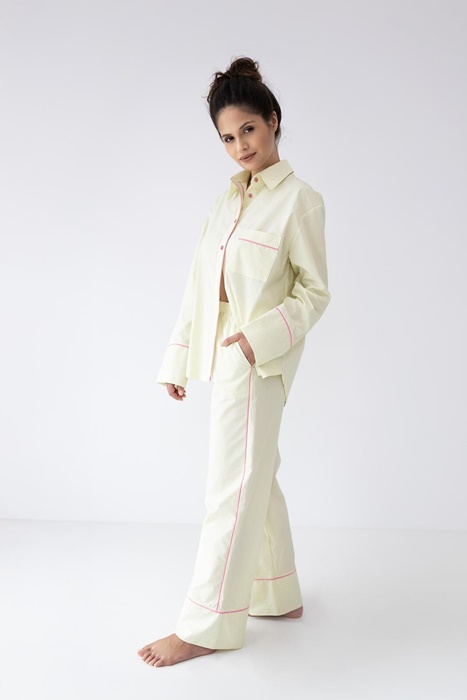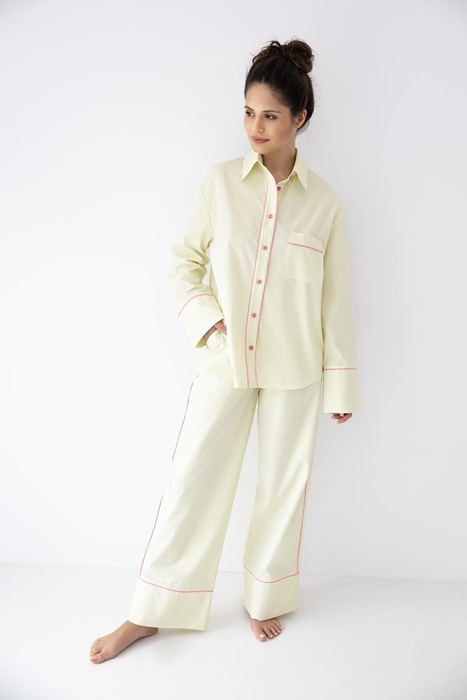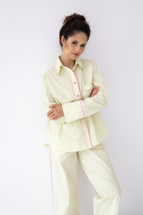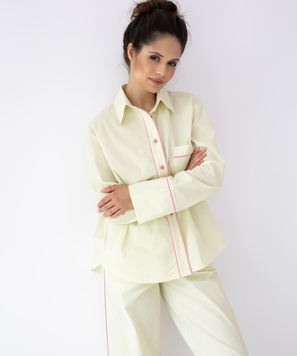 Elegancka Piżama damska rozpinana od Sensis z miękkiej 100% bawełny. Koszulka od piżamy ma dekolt w serek z kołnierzykiem oraz jest zapinana na guziki. Spodnie od piżamy i rękawy są długie. Piżama limonkowa z różowymi lamówkami. Nasza piżama damska jest rozpinana co sprawia że komfortowo ją się zakłada i zdejmuje. Idealna piżama damska dla seniorki, czy dla młodej mamy, piżama rozpinana do karmienia, do porodu, do szpitala, po operacji.