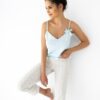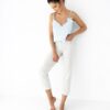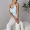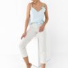 Piżama damska z bluzką na cienkich ramiączkach i spodniami 3/4 długości. Bluzka od piżamy ma dekolt w szpic. Spodnie od piżamy w pasie mają ozdobną satynową kokardkę i są w elegancki wzorek. Błękitna koszulka na ramiączkach po boku ma zdobną kokardę. Piżama ze 100% bawełny.