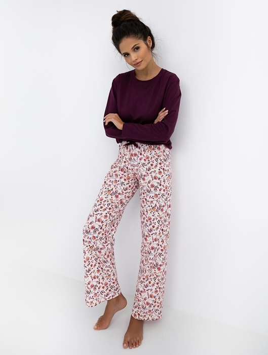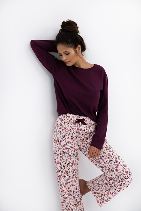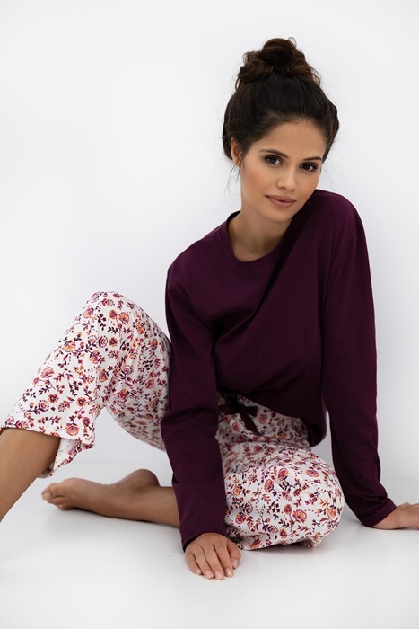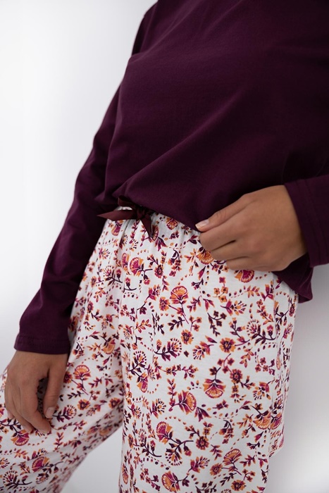 Piżama damska z długim rękawem i długimi spodniami w folkowe kwiatuszki. Bluzka od piżamy ma okrągły dekolt i śliczny głęboki kolor. Piżama damska długa ze 100% bawełny.