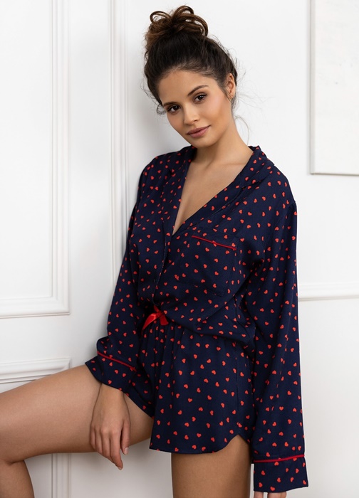 Piżama damska rozpinana w eleganckie serca. Koszulka od piżamy ma dekolt w serek z eleganckim kołnierzykiem oraz jest zapinana na guziki. Na piersi ma kieszonkę. Spodnie od piżamy są krótkie. W pasie spodnie mają wygodną gumkę i ozdobną satynową kokardkę, która dodaje szyku i elegancji. Eleganckie wykończenie rękawów lamówkami. Jeśli szukasz krótkiej piżamy damskiej eleganckiej to ten fason będzie idealny. Nasza piżama damska krótka jest rozpinana co sprawia że komfortowo ją się zakłada i zdejmuje. Idealna piżama damska dla seniorki, czy dla młodej mamy, piżama rozpinana do karmienia, do porodu, do szpitala, po operacji.