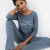 Piżama damska z rękawem 3/4 długości i długimi spodniami w stalowo niebieskim kolorze. Bluzka od piżamy ma okrągły dekolt. Spodnie od piżamy w pasie mają ozdobną satynową kokardkę.