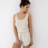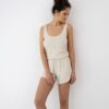 Piżama damska kótka Sensis – krótkie szorty i bluzka na ramiączkach. Piżama krótka w kolorze jasny bezowy. Materiał w lekki prążek. Idealna krótka piżama damska na lato, upały.