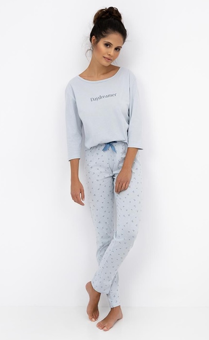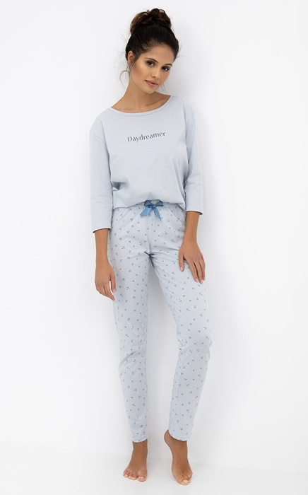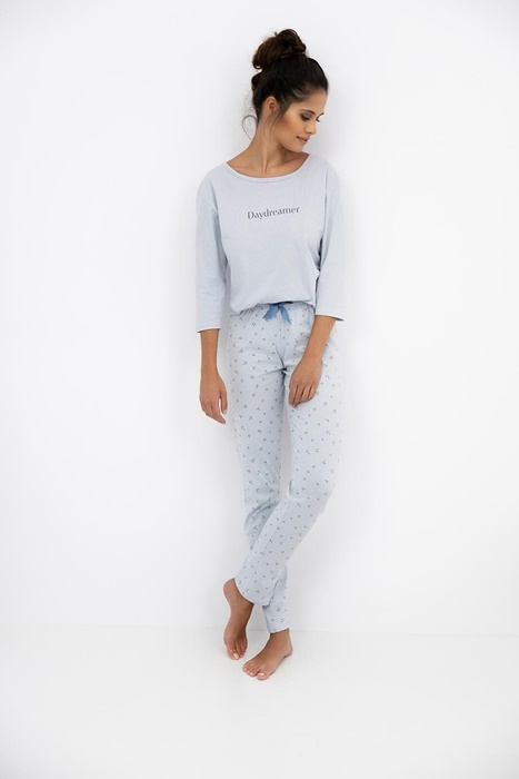 Piżama damska z bluzką z rękawem 3/4 i z długimi spodniami. Bluzka od piżamy ma okrągły dekolt. Spodnie od piżamy są długie, w elegancki wzorek.