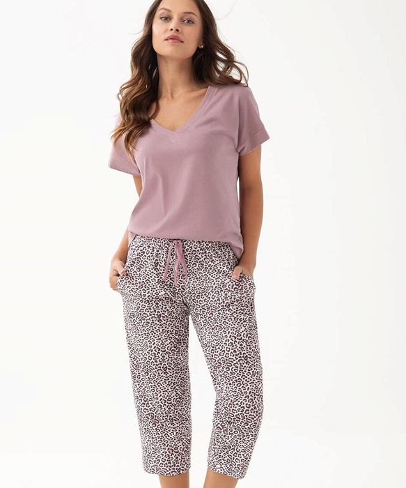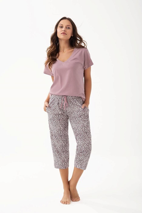 Piżama damska z krótkim rękawem i spodenkami 3/4 (rybaczki). Koszulka ma dekolt w szpic, w pasie troczek. Spodenki we wzór w panterkę. Piżama damska uszyta jest z wysokiej jakości 100% bawełny.