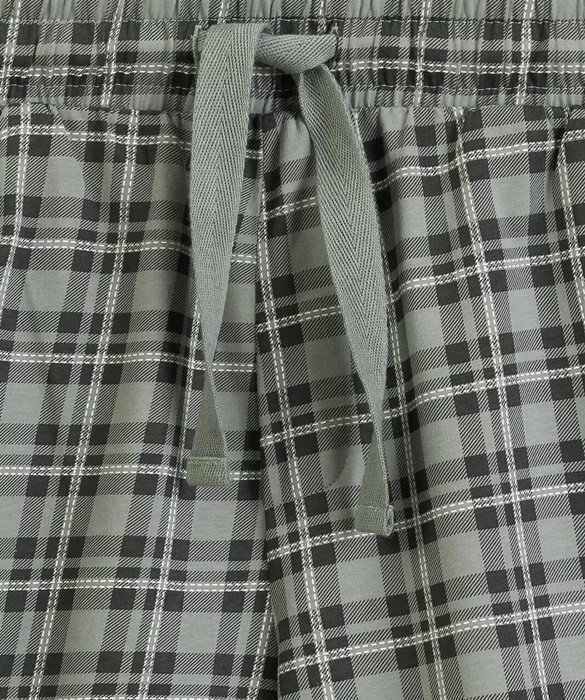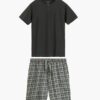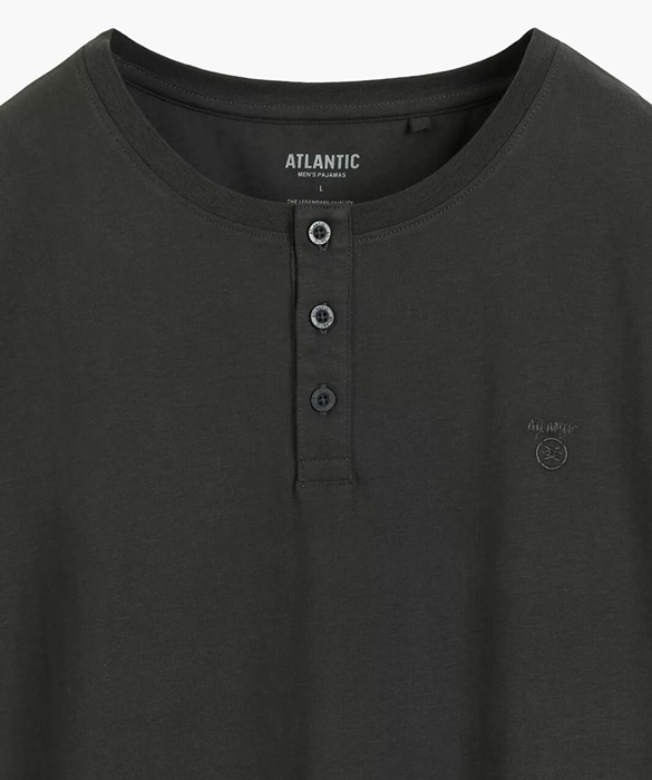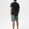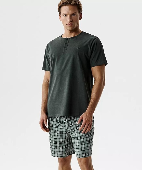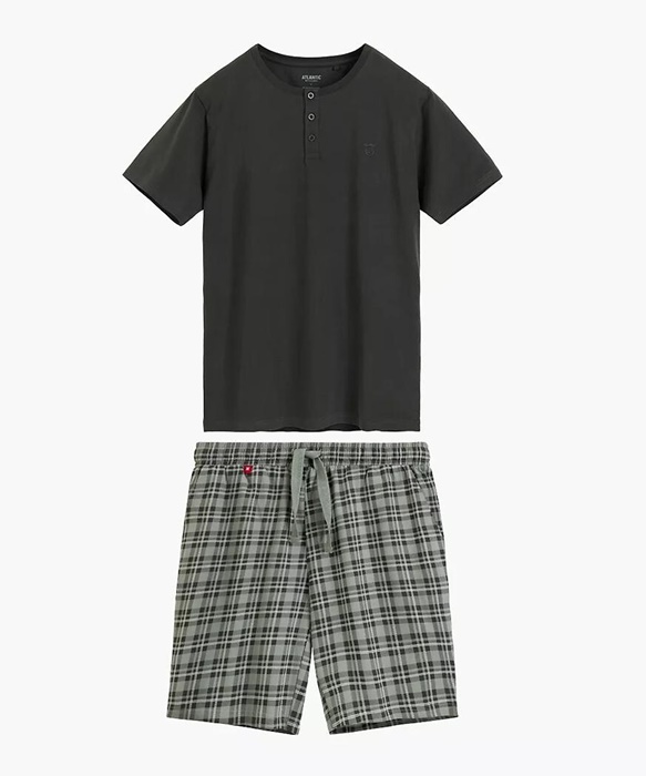 Piżama męska Atlantic z krótkim rękawem oraz krótkimi spodenkami. Bluzka od piżamy z krótkim rękawkiem ma okrągły dekolt z 3 guzikami. Krótkie spodenki są w kratkę.