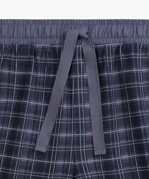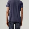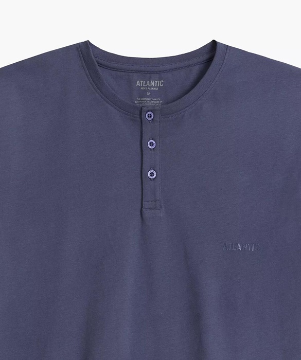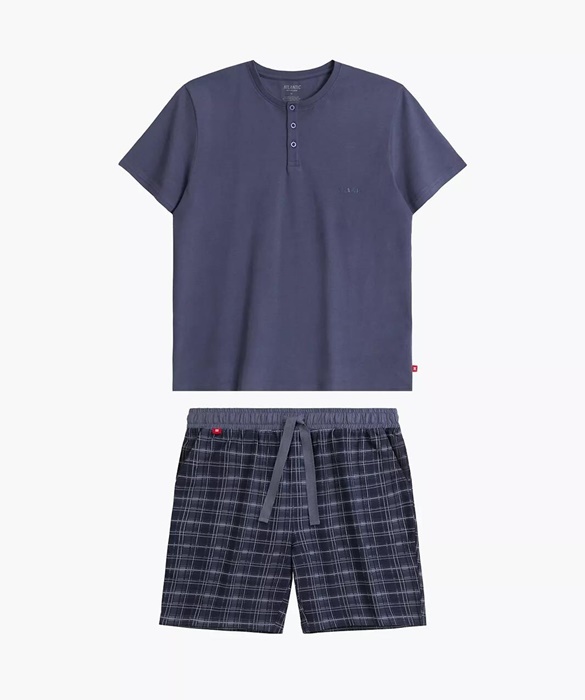 Piżama męska Atlantic z krótkim rękawem oraz krótkimi spodenkami. Bluzka od piżamy z krótkim rękawkiem ma okrągły dekolt. Góra bluzki zapinana jest na 3 guziki. Krótkie spodenki w kratkę w pasie mają sznureczek do reglacji.