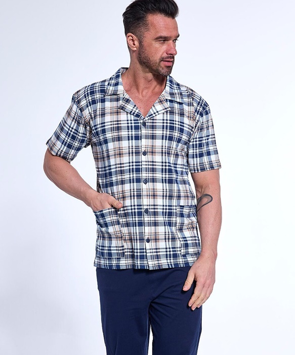 Piżama męska z krótkim rękawem i długimi spodniami. Bluzka od piżamy z krótkim rękawem ma dekolt w szpic z kołnierzykiem i jest rozpinana na guziki. Rozpinana koszulka od piżamy męskiej ma po bokach kieszenie. Spodnie z wygodną gumką w jednolitym kolorze. Koszulka rozpinana ma elegancki wzór w kratę. Piżama męska rozpinana ze 100% bawełny.