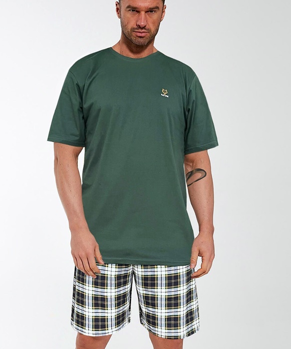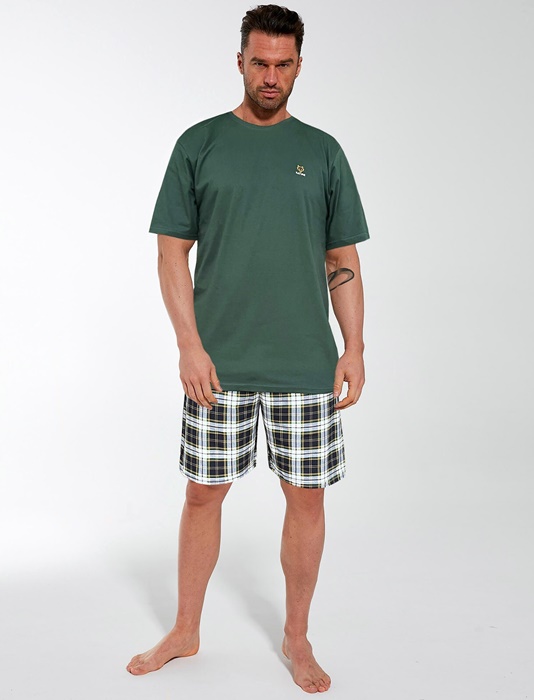 Piżama męska Cornette z krótkim rękawem oraz krótkimi spodenkami. Bluzka od piżamy z krótkim rękawkiem ma okrągły dekolt. Spodnie są w kratę. Krótka piżama męska z bawełny.
