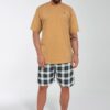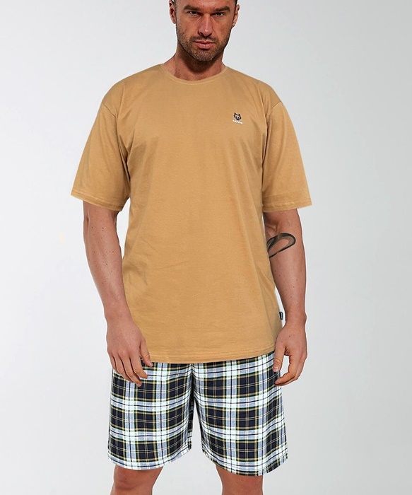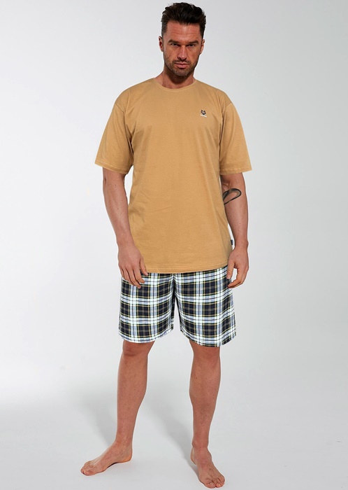 Piżama męska Cornette z krótkim rękawem oraz krótkimi spodenkami. Bluzka od piżamy z krótkim rękawkiem ma okrągły dekolt. Spodnie są w kratę. Krótka piżama męska z bawełny.
