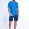 Piżama męska Cornette z krótkim rękawem oraz krótkimi spodenkami w ciemniejszym odcieniu niebieskiego. Bluzka od piżamy z krótkim rękawkiem ma okrągły dekolt. Spodnie są w elegancką kratę. Krótka piżama męska ze 100% bawełny.