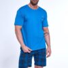 Piżama męska Cornette z krótkim rękawem oraz krótkimi spodenkami w ciemniejszym odcieniu niebieskiego. Bluzka od piżamy z krótkim rękawkiem ma okrągły dekolt. Spodnie są w elegancką kratę. Krótka piżama męska ze 100% bawełny.