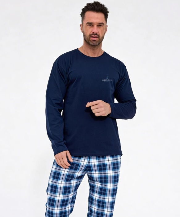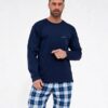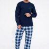 Piżama męska długa Cornette granatowa ze spodniami w kratkę.