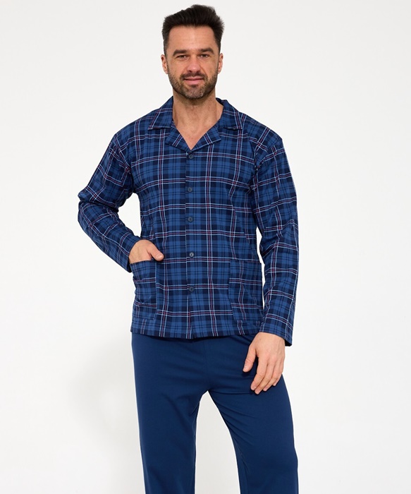 Piżama męska z długim rękawem i długimi spodniami. Bluzka od piżamy z długim rękawem ma dekolt w szpic z kołnierzykiem i jest rozpinana na guziki. Rozpinana koszulka od piżamy męskiej ma po bokach kieszenie. Spodnie z wygodną gumką w jednolitym kolorze. Koszulka rozpinana ma elegancki wzór w kratę. Piżama męska rozpinana ze 100% bawełny.
