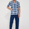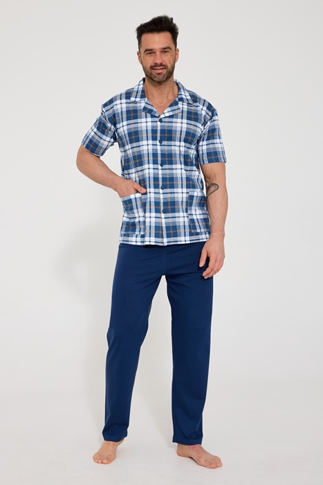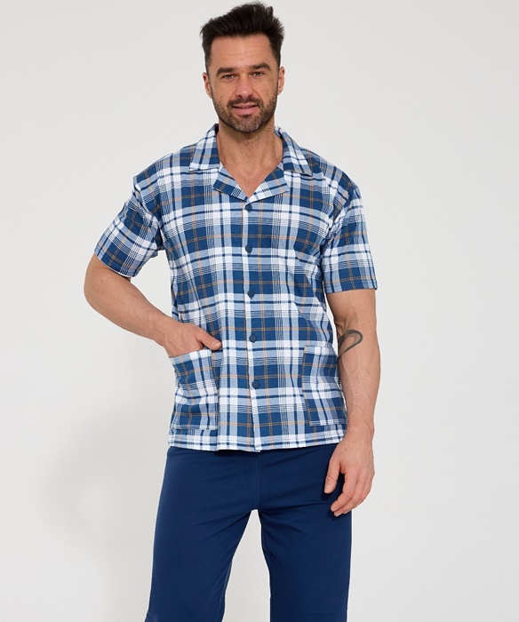 Piżama męska z krótkim rękawem i długimi spodniami. Bluzka od piżamy z krótkimi rękawami ma dekolt w szpic z kołnierzykiem i jest rozpinana na guziki. Rozpinana koszulka od piżamy męskiej ma po bokach kieszenie. Spodnie z wygodną gumką w jednolitym kolorze. Koszulka rozpinana ma elegancki wzór w kratę. Piżama męska rozpinana ze 100% bawełny.