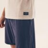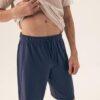 Piżama męska z krótkim rękawem i krótkimi spodniami, do kolan. Koszulka od piżamy ma okrągły dekolt. Spodnie są długości do kolan, z wygodną gumką. Piżama męska w kolorze kremowo granatowym. Piżama męska krótka ze 100% bawełny.