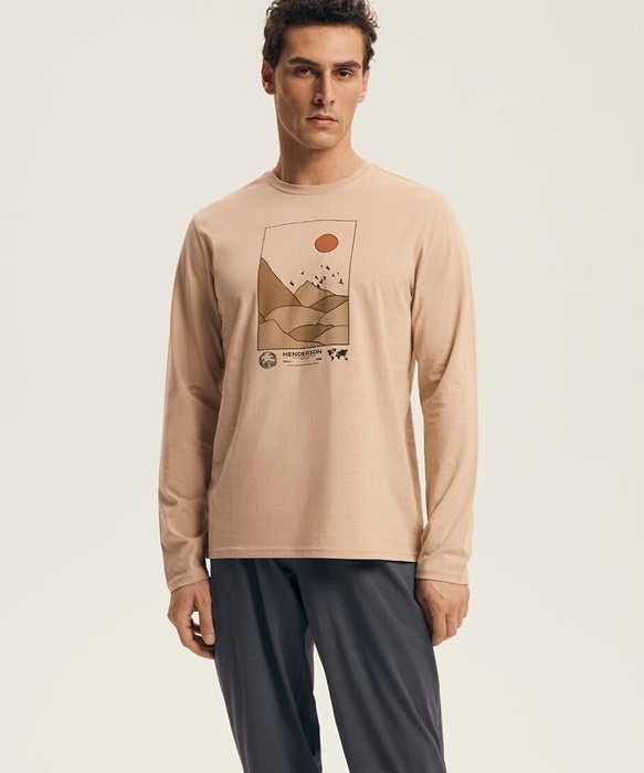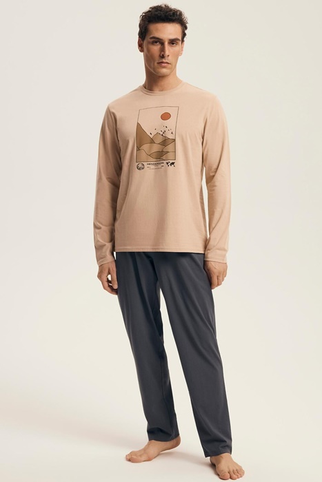 Piżama męska z długim rękawem i długimi spodniami. Koszula od piżamy jest z długim rękawem ma okrągły dekolt. Spodnie są długie, z wygodną szeroką gumką. Piżama męska długa z beżową bluzką i szaroniebieskim spodniami. Piżama męska ze 100% bawełny od Henderson.