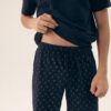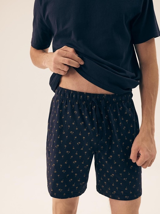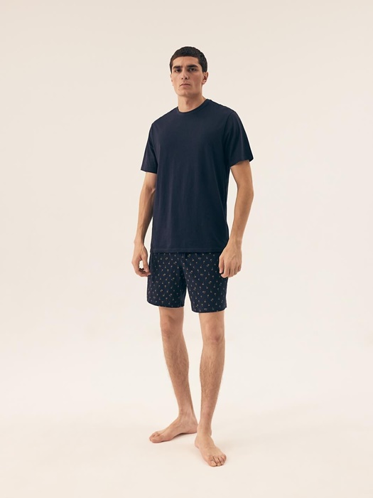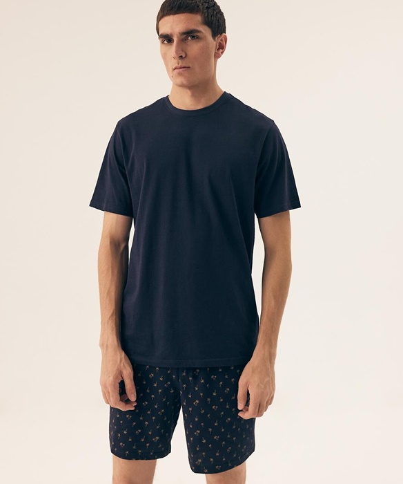 Piżama męska z krótkim rękawem i krótkimi spodniami we wzorek. Koszulka od piżamy ma okrągły dekolt. Spodnie są z wygodną gumką. Piżama męska w kolorze granatowym. Piżama męska krótka ze 100% bawełny.