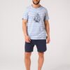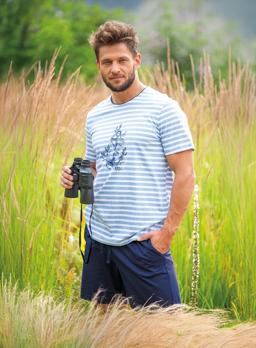 Piżama męska Key z krótkim rękawem oraz krótkimi spodenkami. Bluzka od piżamy z krótkim rękawkiem ma okrągły dekolt. Spodnie są krótkie, z kieszeniami po bokach. Krótka piżama męska ze 100% miękkiej bawełny.