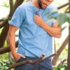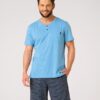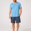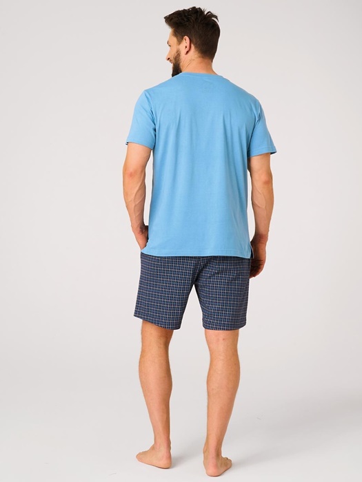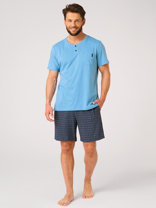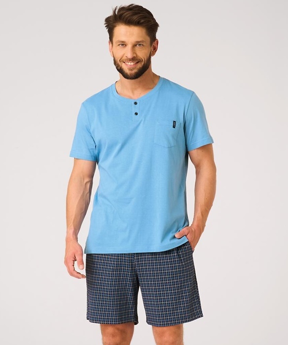 Piżama męska Key z krótkim rękawem oraz krótkimi spodenkami. Bluzka od piżamy z krótkim rękawkiem ma okrągły dekolt. Spodnie są krótkie, z kieszeniami po bokach. Krótka piżama męska ze 100% miękkiej bawełny.