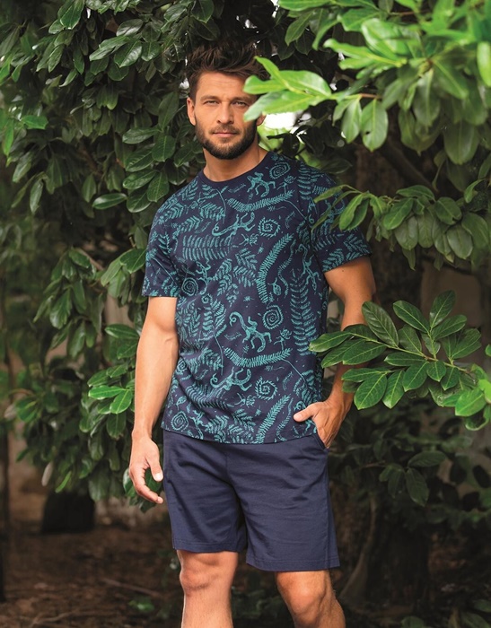 Piżama męska Key z krótkim rękawem oraz krótkimi spodenkami. Bluzka od piżamy z krótkim rękawkiem ma okrągły dekolt. Spodnie są krótkie, z kieszeniami po bokach. Krótka piżama męska ze 100% miękkiej bawełny.