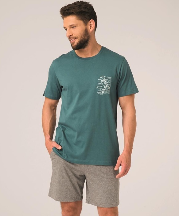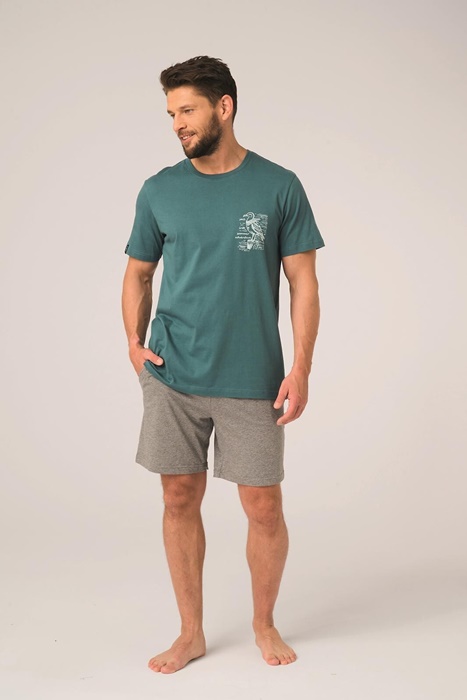Piżama męska Key z krótkim rękawem oraz krótkimi spodenkami. Bluzka od piżamy z krótkim rękawkiem ma okrągły dekolt. Spodnie są krótkie, z kieszeniami po bokach. Krótka piżama męska ze 100% miękkiej bawełny.