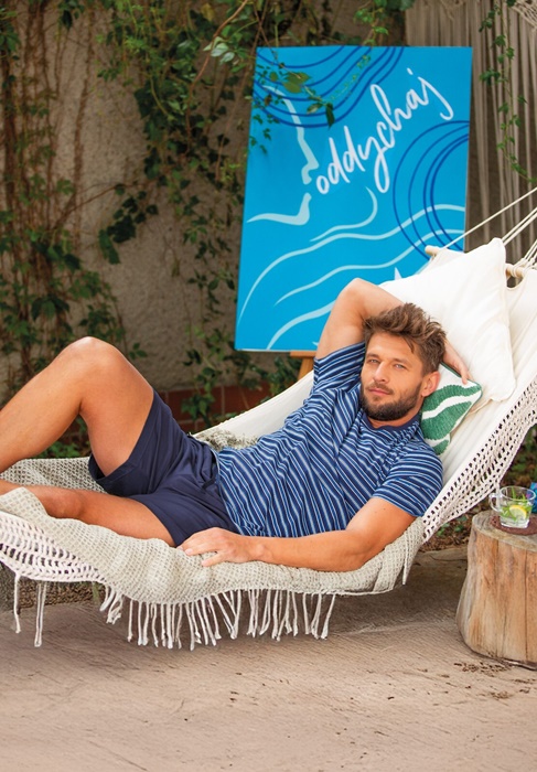Piżama męska Key z krótkim rękawem oraz krótkimi spodenkami. Bluzka od piżamy z krótkim rękawkiem ma okrągły dekolt. Spodnie są krótkie, z kieszeniami po bokach. Krótka piżama męska ze 100% miękkiej bawełny.