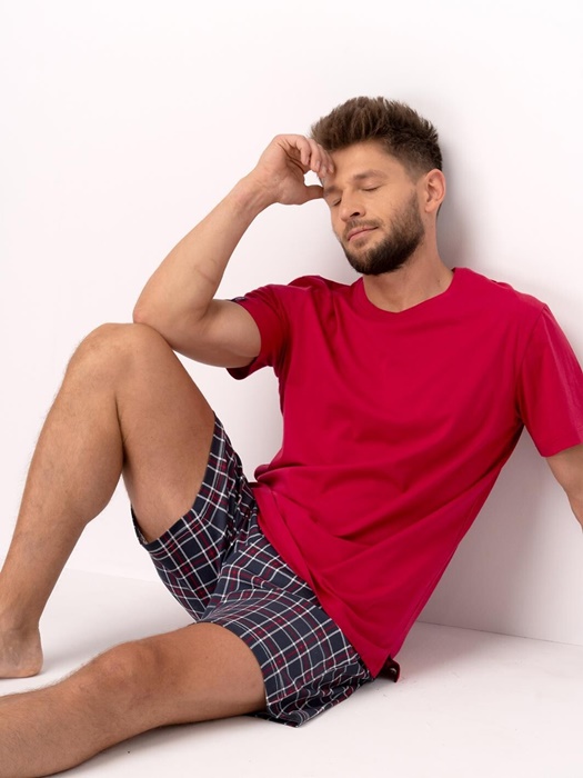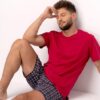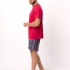 Piżama męska Key z krótkim rękawem oraz krótkimi spodenkami w kratkę. Czerwona bluzka od piżamy z krótkim rękawkiem ma okrągły dekolt. Spodnie są krótkie, w kratę, z kieszeniami. Krótka piżama męska ze 100% miękkiej bawełny.