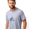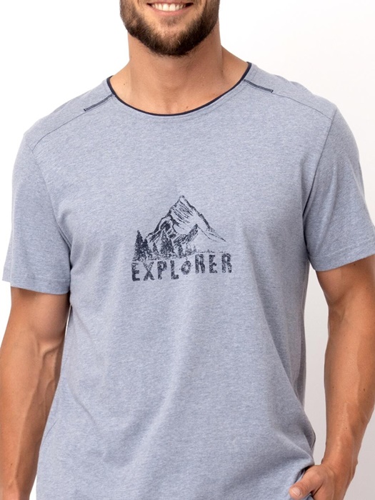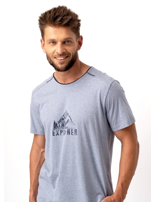 Piżama męska Key z krótkim rękawem oraz krótkimi spodenkami. Bluzka od piżamy z krótkim rękawkiem ma okrągły dekolt i grafikę. Spodnie są krótkie, granatowe, z kieszeniami. Krótka piżama męska ze 100% bawełny.