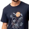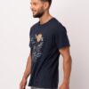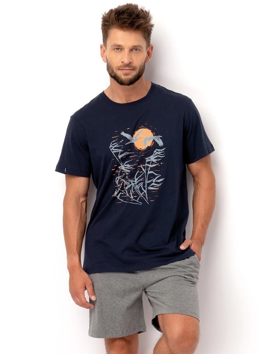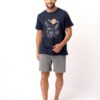 Piżama męska Key z krótkim rękawem oraz krótkimi spodenkami. Granatowa bluzka od piżamy z krótkim rękawkiem ma okrągły dekolt i ciekawą grafikę. Spodnie są krótkie, szare, z kieszeniami. Krótka piżama męska ze 100% miękkiej bawełny.