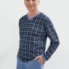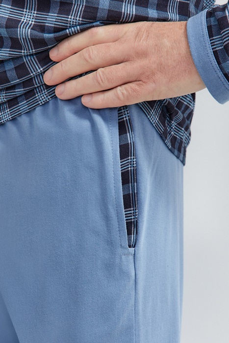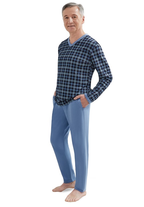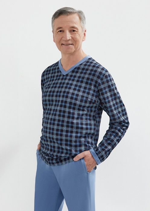 Piżama męska Martel z długim rękawem i z długimi spodniami. Bluzka od piżamy ma dekolt w szpic, jest w kratkę. Spodnie są długie, jednolite, a po bokach mają kieszenie. Długa piżama męska ze 100% bawełny.