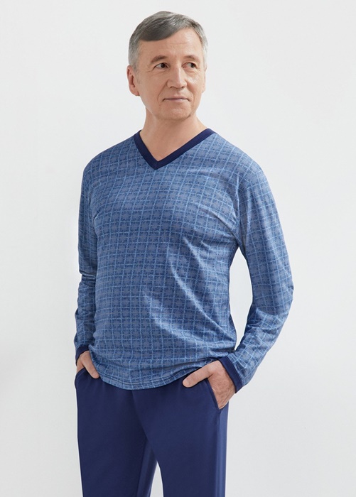 Piżama męska Martel z długim rękawem i z długimi spodniami. Bluzka od piżamy ma dekolt w szpic, jest w kratkę. Spodnie są długie, jednolite, a po bokach mają kieszenie. Długa piżama męska ze 100% bawełny.