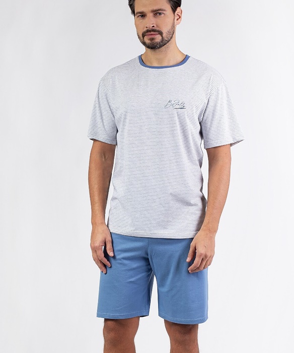 Piżama męska Regina z krótkim rękawem i krótkimi spodenkami. Bluzka od piżamy jest w paseczki i ma okrągły dekolt. Krótkie spodenki są w jednolitym kolorze. Piżama męska krótka uszyta jest ze 100% bawełny.