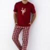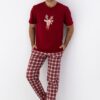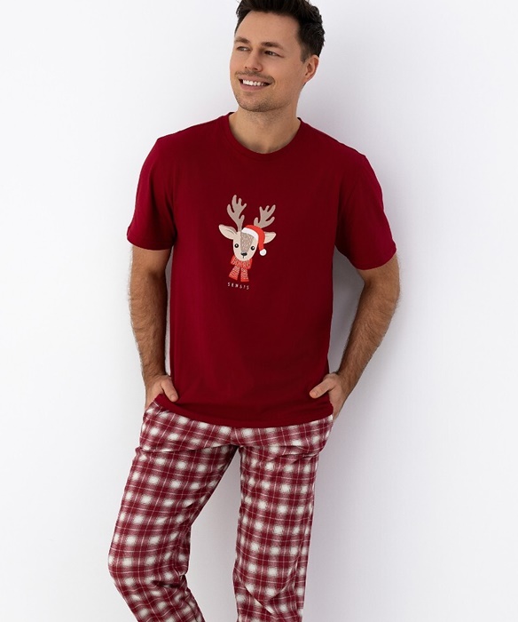 Piżama męska Świąteczna Sensis z krótkim rękawem i długimi spodniami w kratkę. Piżama męska ze 100% bawełny. Bluzka od piżamy z krótkim rękawem ma okrągły dekolt i grafikę renifera. Po bokach spodni kieszenie. Spodnie z wygodną gumką, w Świąteczną kratę w bordowym kolorze.