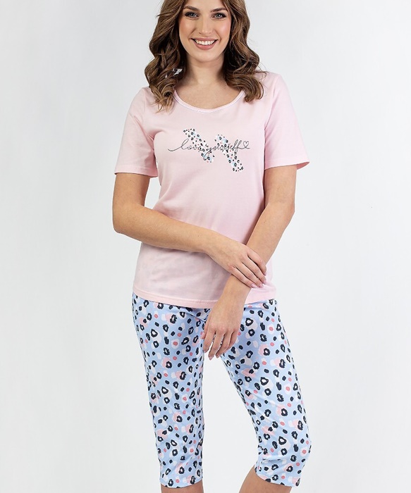 Piżama damska Regina, z krótkim rękawem i spodenkami 3/4 długości. Bluzka od piżamy z ozdobną grafiką i spodenki w cętki. Spodnie rybaczki są długości 3/4. Piżama damska Regina uszyta jest z delikatnej, wysokiej jakości 100% bawełny.