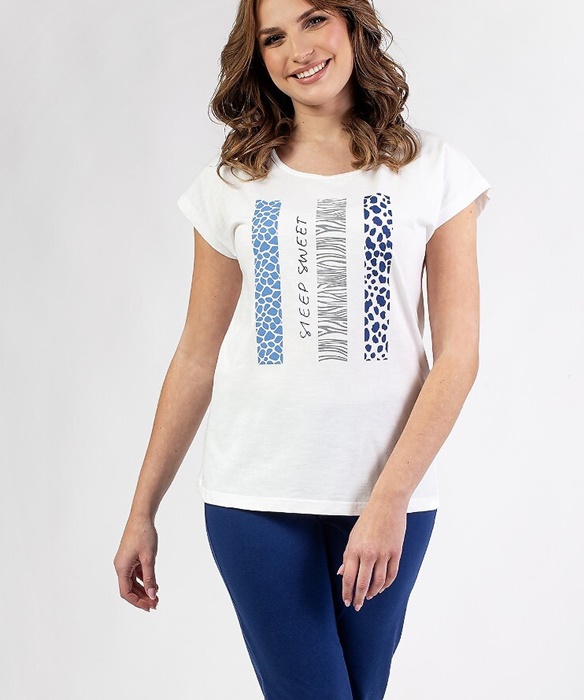 Piżama damska Regina, z krótkim rękawem i spodenkami 3/4 długości. Bluzka od piżamy ma ozdobną grafikę. Spodnie rybaczki długości 3/4 są jednolitego koloru. Piżama damska Regina uszyta jest z delikatnej, wysokiej jakości 100% bawełny.