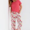 Piżama damska Taro z krótkim rękawkiem, oraz spodniami 7/8 długości. Koralowa bluzka od piżamy ma okrągły dekolt. Wzorzyste spodnie od piżamy mają długość 7/8 i są w kwiatowy wzór. Spodnie po bokach mają kieszenie. Piżama damska uszyta ze 100% bawełny.