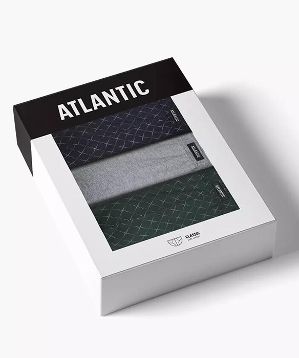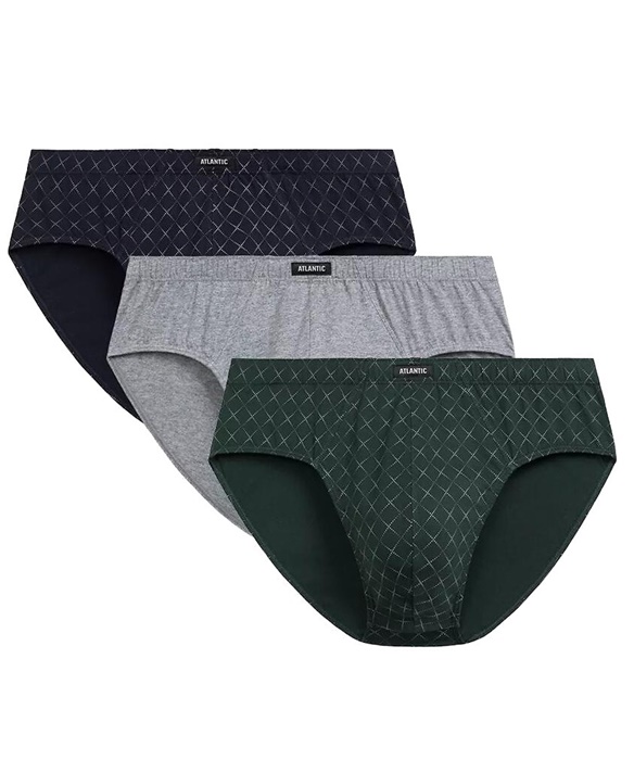 Slipy męskie Atlantic – zestaw 3 sztuk 100% bawełnianych majtek męskich. W pasie nieuciskająca miękka gumka z naszytym logo Atlantic. Majtki męskie uszyte są z wysokiej jakości, miękkiej bawełny. Slipy męskie pakowane są w pudełko po 3 sztuki.