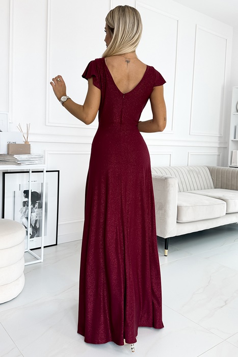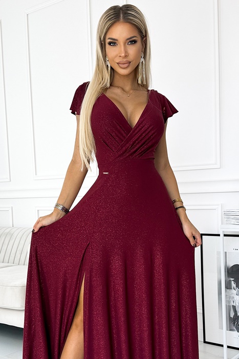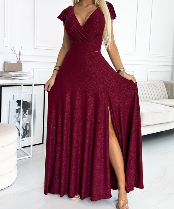 Elegancka długa Sukienka – długa do ziemi suknia z brokatowego materiału. Posiada elegancki kopertowy dekolt na zakładkę i krótkie rękawki. Sukienka ma rozcięcie do połowy uda, które dodaje kobiecego wdzięku. Fason sukienki z pięknie podkreśloną talią. Fason i materiał podkreślają figurę. Połyskujący brokatowy materiał nadaje sukience blasku i elegancji. Sukienka długa idealna na wieczorne wyjścia, bale, Święta, komunię, śluby i inne eleganckie przyjęcia.