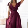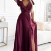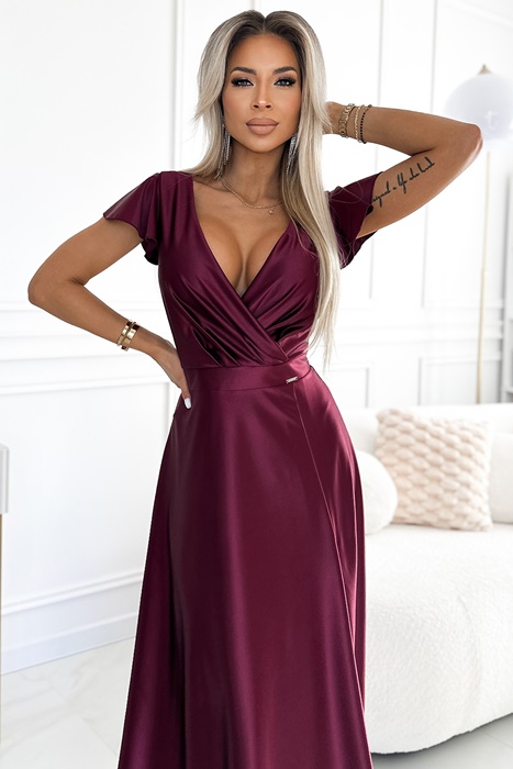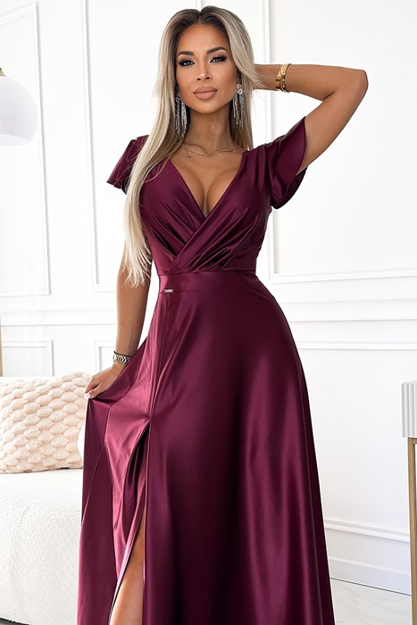 Elegancka długa Sukienka – długa do ziemi suknia z satynowego materiału. Posiada elegancki kopertowy dekolt na zakładkę i krótkie rękawki. Sukienka ma rozcięcie do połowy uda, które dodaje kobiecego wdzięku. Fason sukienki z pięknie podkreśloną talią. Fason i materiał podkreślają figurę. Połyskujący materiał nadaje sukience blasku i elegancji. Sukienka długa idealna na wieczorne wyjścia, bale, Święta, komunię, śluby i inne eleganckie przyjęcia.