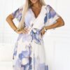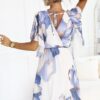 Zwiewna krótka Sukienka długości do kolan, z eleganckiego materiału w kolorze biało błękitnym. Sukienka uszyta ze zwiewnego materiału, z kopertowym dekoltem, krótkimi, luźnymi rękawkami i wiązaniem w talii, pięknie podkreśla sylwetkę i dodaje wdzięku. Lekka sukienka letnia z szerokimi motylkowymi rękawami. Dzięki uniwersalnemu krojowi sukienka pasuje na rozmiar od S do 2XL.